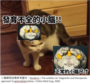 而母貓在懷孕時感染,病毒就穿越胎盤影響胎兒發育,導致小腦發育不全,有些併發腦積水或其他的畸形。