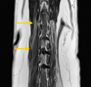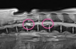 但這次的狀況有點不同,多數IVDD案例,常見的是單一節椎間盤突出壓迫脊髓,造成癱瘓症狀。但這位小朋友在MRI檢查下,竟然發現有兩處脊髓受壓迫!