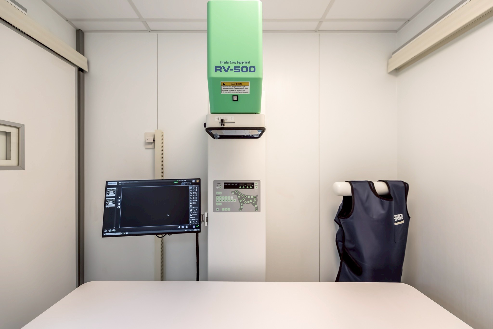 本院使用首美達 RV-500 日本小動物專用高頻 X 光機,高頻技術將電力更有 效地轉換,能用更低的 X 光攝影劑量,達到更加的影像品質。完整的動物 圖像面板設計及內建上千個攝影參數,讓影像品質更為優化,數位 X 光系 統也可以大幅減少後製處理等待時間,減少模糊影像的發生機會。
